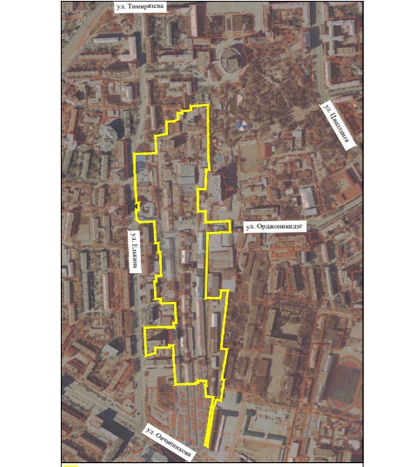 Схема границ подлежащей комплексному развитию территории нежилой застройки, расположенной в микрорайоне, ограниченном улицами Елькина, Тимирязева, Цвиллинга, Овчинникова (территория № 1) в Советском районе города Челябинска